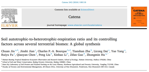 近日,我院生态服务功能监测与评估团队在国际著名期刊CATENA发表题为“Soil autotrophic-to-heterotrophic-respiration ratio and its controlling factors across several terrestrial biomes: A global synthesis”的研究论文(https://www.sciencedirect.com/science/article/abs/pii/S0341816224003151)。该论文的第一作者为青年教师靳川,通讯作者为胡中民教授,william威廉中文官网为第一单位。