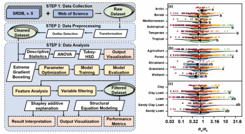 鉴于此,本文基于最新的全球土壤呼吸数据库(SRDB v.5)并结合已发表文献进行了系统的综合分析,考虑了气候、土壤和植被特征对Ra/Rh的直接和间接影响。该研究采用了当下流行的机器学习技术,利用极端梯度提升(xgboost)量化了各变量对Ra、Rh和Ra/Rh的影响,并辅以沙普利加性解释(Shapley Additive exPlanations,SHAP)方法阐述其潜在的调控关系。最后,结合结构方程模型(SEM)探究各变量之间的直接和间接关系。