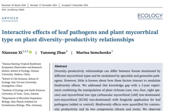 近日,我院席念勋副教授在国际生态学著名期刊Ecology上以“Interactive effects of leaf pathogens and plant mycorrhizal type on plant diversity–productivity relationships”为题发表最新研究成果。