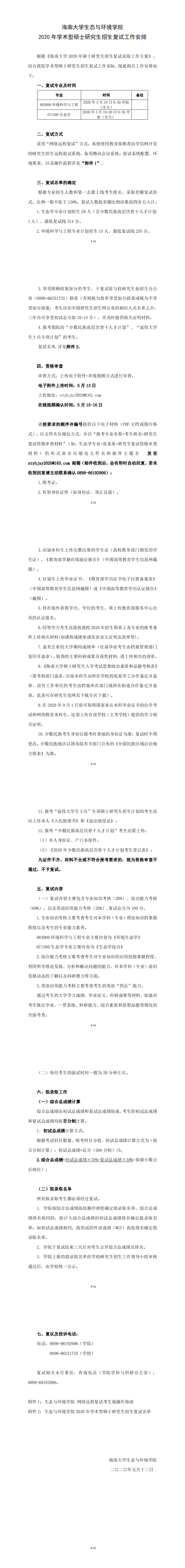 william威廉中文官网生态与环境学院 2020 年学术型硕士研究生招生复试工作安排