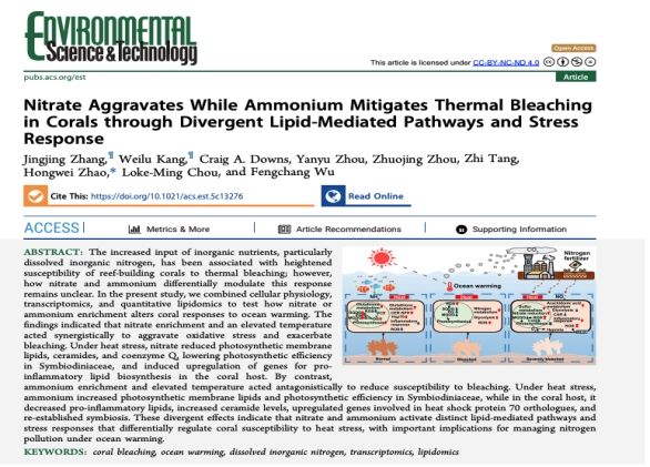 近日,一项由生态学院海南省珊瑚礁生态学国际联合研究中心赵洪伟教授科研团队完成的重要研究揭示了不同形态的氮污染物——硝态氮和铵态氮,在国家一类海水水质相关浓度下,对受热胁迫的珊瑚会产生截然相反的生理效应。该研究成果为深入理解气候变化与营养盐污染复合作用对珊瑚礁生态系统的影响提供了全新视角,并首次提出了一个可指导水质管理的具体硝酸盐浓度阈值。相关论文已发表于Nature Index收录期刊《Environmental Science & Technology》。