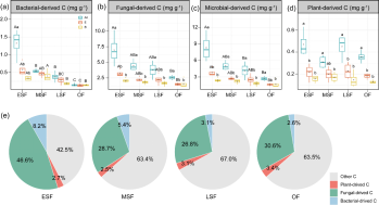 图1 不同恢复阶段热带森林微生物和植物来源碳对土壤有机碳的贡献