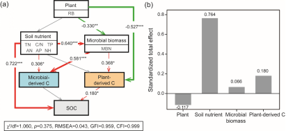 图2 环境因素对微生物和植物来源碳的影响