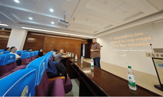 Charles Bourque教授以《Forest-cover-loss control on year-round river flow dynamics》为题,讲述了北美东北部圣约翰河盆地上游森林流失对全年水流量动态的影响。讲座期间,Bourque教授深入剖析了森林流失对水循环的影响,吸引了在场师生的广泛关注与深思。互动环节中,大家积极发言,提出了诸多问题和见解