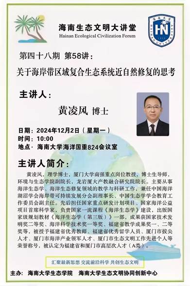 2024年12月2日上午,厦门大学南强重点岗位教授,环境与生态学院副院长,龙岩厦大产教融合研究院院长黄凌风教授在william威廉中文官网海洋国重824会议室为师生们做了题为《关于海岸带区域复合生态系统近自然修复的思考》的主题报告。本次学术会议由william威廉中文官网生态学院赵洪伟教授主持。