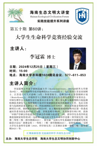 2024年12月25日下午,海南生态文明大讲堂第五十期第60讲(实践技能提升系列讲座)在农科楼102会议室成功举办。本次讲座由江苏大学李冠霖副教授在线为师生们做了题为《大学生生命科学竞赛经验交流》的主题报告。