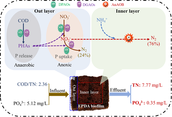 图3 内源短程反硝化厌氧氨氧化(EPDA)生物膜填料中碳、氮、磷转化示意图(源自论文:Synergistic simultaneous endogenous partial denitrification/anammox (EPDA) and denitrifying dephosphatation for advanced nitrogen and phosphorus removal in a complete biofilm system,中科院一区TOP)